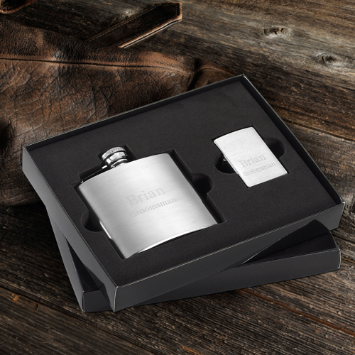 THE BEST GIFT YOU CAN GET FOR YOUR GROOMSMEN! Save some hard earned cash with this two gifts in one Personalized Flask and Zippo Lighter Gift Set! This classy styled set features a customized brushed stainless steel flask and a unique zippo lighter. The flask holds 4 ounces. The windproof lighter features a sturdy metal casing and is made in the USA with Zippo's famous lifetime guarantee. The flask measures 3 1/2" x 2 1/2" x 3/4". The Zippo measures 1 1/2" x 2 1/8" x 1/2". PERSONALIZATION: 2 lines up to 15 characters (engraving will be the same on both items).