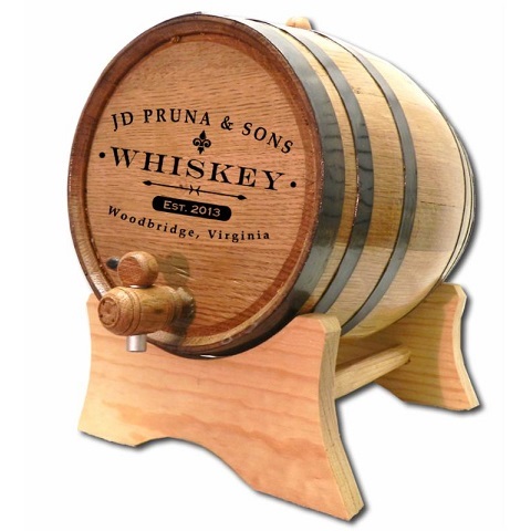 An awesome design on a laser inscribed American White Oak barrel. Each barrel is handcrafted and have a medium char. Your custom barrel will come with the stand, bung, wooden spigot and storing tablet. Natural variations of wood and the overall appearance of the inscription will vary slightly. Customize it for you, but enter exactly as you would like your personalization to appear on the barrel! PERSONALIZATION: LINE #1: replace "JD PRUNA & SONS", LINE #2: replace "EST. 2013", LINE #3: replace "Woodbridge, Virgina". SPECIAL INSTRUCTIONS: black or silver bands.